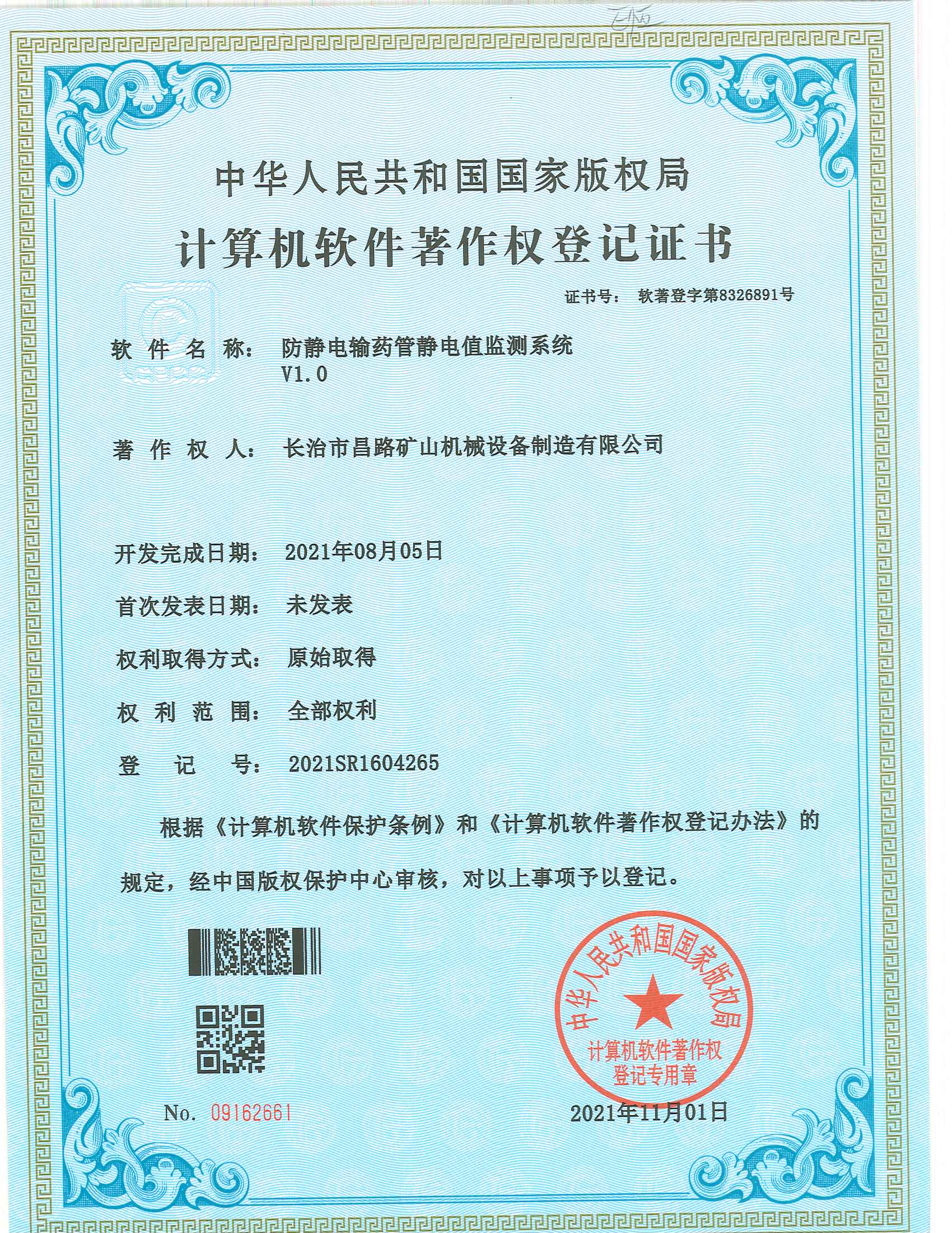 榮獲防靜電輸藥管靜電值監(jiān)測系統(tǒng)著作權登記證書