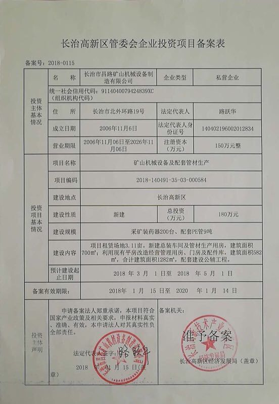 長治高新區(qū)管委會企業(yè)投資項(xiàng)目備案表